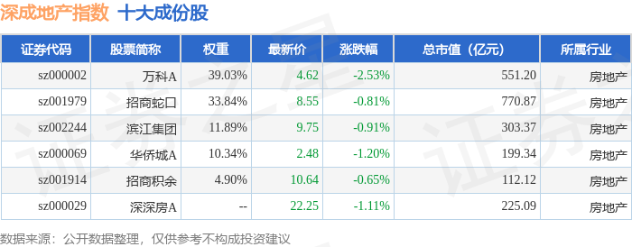 证券之星消息,12月30日,深成地产(971001)指数报收于408.21点,跌1.47%,成交16.9亿元,换手率1.02%。当日该指数成份股中,下跌的有6家,万科A以2.53%的跌幅领跌。