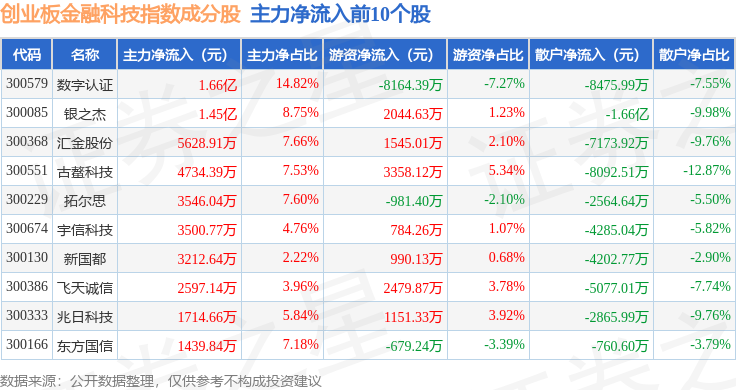 资金流向方面,创业板金融科技(970085)指数成份股当日主力资金净流出合计6.08亿元,游资资金净流入合计3.96亿元,散户资金净流入合计2.12亿元。成份股资金流向详情见下表: