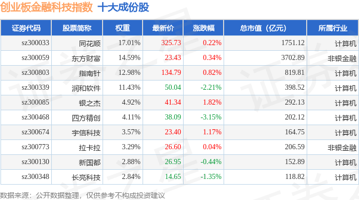 创业板金融科技(970085)指数十大成份股详情如下: