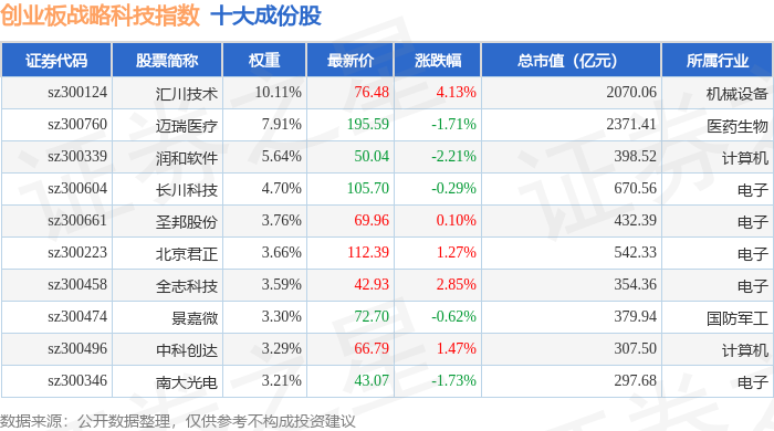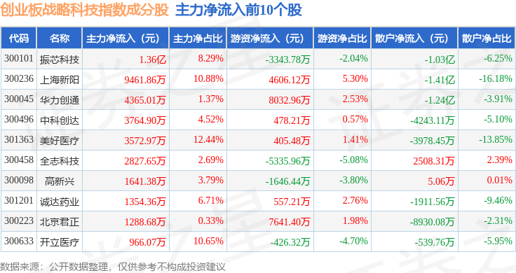 资金流向方面,创业板战略科技(971004)指数成份股当日主力资金净流出合计14.93亿元,游资资金净流入合计5.43亿元,散户资金净流入合计9.5亿元。成份股资金流向详情见下表: