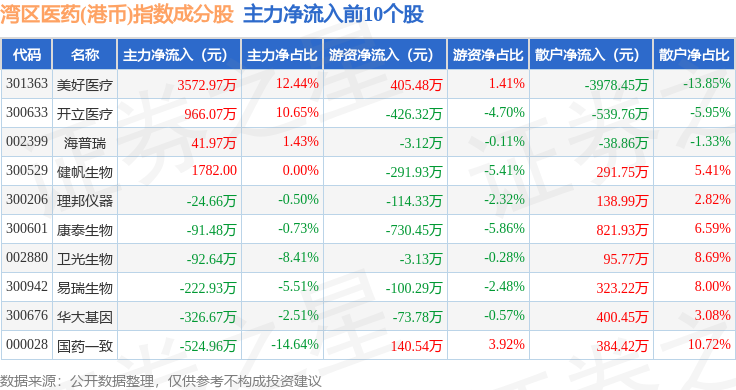资金流向方面,湾区医药(港币)(980014)指数成份股当日主力资金净流出合计3.47亿元,游资资金净流出合计1.32亿元,散户资金净流入合计4.79亿元。成份股资金流向详情见下表: