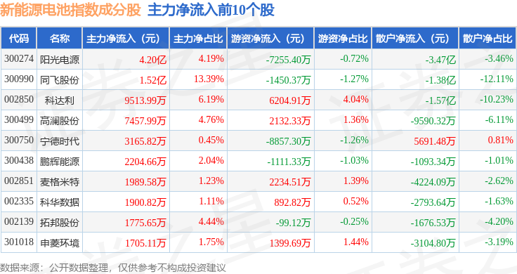 资金流向方面,新能源电池(980027)指数成份股当日主力资金净流出合计6.94亿元,游资资金净流入合计2.82亿元,散户资金净流入合计4.12亿元。成份股资金流向详情见下表: