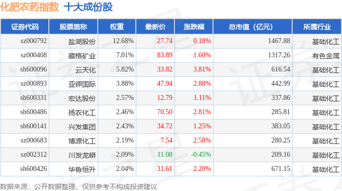 证券之星消息,12月30日,化肥农药(980035)指数报收于2277.44点,涨1.08%,成交169.26亿元,换手率1.68%。当日该指数成份股中,上涨的有32家,中欣氟材以5.4%的涨幅领涨,下跌的有29家,国光股份以5.59%的跌幅领跌。