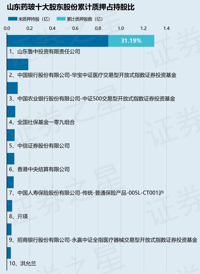 截止本公告日,股东山东鲁中投资有限责任公司已累计质押股份4036.0万股,占其持股总数的31.19%。本次质押后山东药玻十大股东的累计质押股份占持股比例(占持股比例的计算以公司最新一期财务报表公布的十大股东的持股总数为基准)见下图: