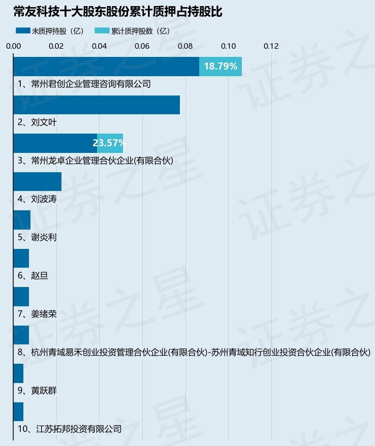 截止本公告日,股东常州君创企业管理咨询有限公司已累计质押股份200.0万股,占其持股总数的18.79%,股东常州龙卓企业管理合伙企业(有限合伙)已累计质押股份120.0万股,占其持股总数的23.57%。本次质押后常友科技十大股东的累计质押股份占持股比例(占持股比例的计算以公司最新一期财务报表公布的十大股东的持股总数为基准)见下图: