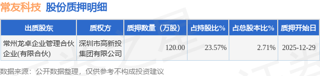 证券之星消息,常友科技(301557)12月30日公开信息显示,股东常州龙卓企业管理合伙企业(有限合伙)向深圳市高新投集团有限公司合计质押120.0万股,占总股本2.71%。质押详情见下表:
