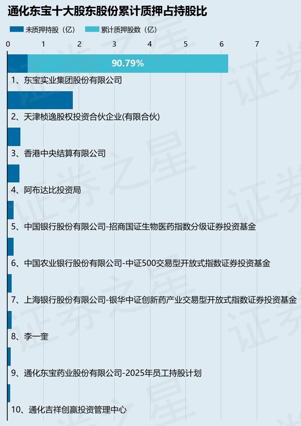 截止本公告日,股东东宝实业集团股份有限公司已累计质押股份5.62亿股,占其持股总数的90.79%。本次质押后通化东宝十大股东的累计质押股份占持股比例(占持股比例的计算以公司最新一期财务报表公布的十大股东的持股总数为基准)见下图: