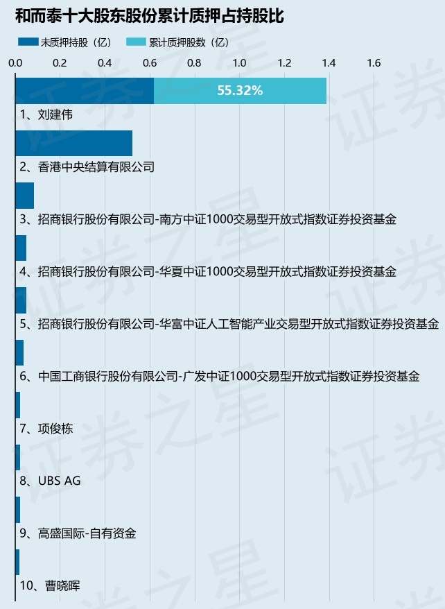 截止本公告日,股东刘建伟已累计质押股份7675.81万股,占其持股总数的55.32%。本次质押后和而泰十大股东的累计质押股份占持股比例(占持股比例的计算以公司最新一期财务报表公布的十大股东的持股总数为基准)见下图: