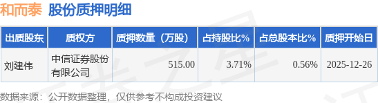 证券之星消息,和而泰(002402)12月30日公开信息显示,股东刘建伟向中信证券股份有限公司合计质押515.0万股,占总股本0.56%。质押详情见下表: