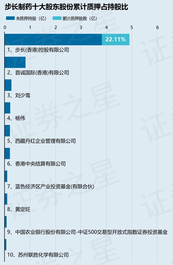 截止本公告日,股东步长(香港)控股有限公司已累计质押股份1.09亿股,占其持股总数的22.11%。本次质押后步长制药十大股东的累计质押股份占持股比例(占持股比例的计算以公司最新一期财务报表公布的十大股东的持股总数为基准)见下图: