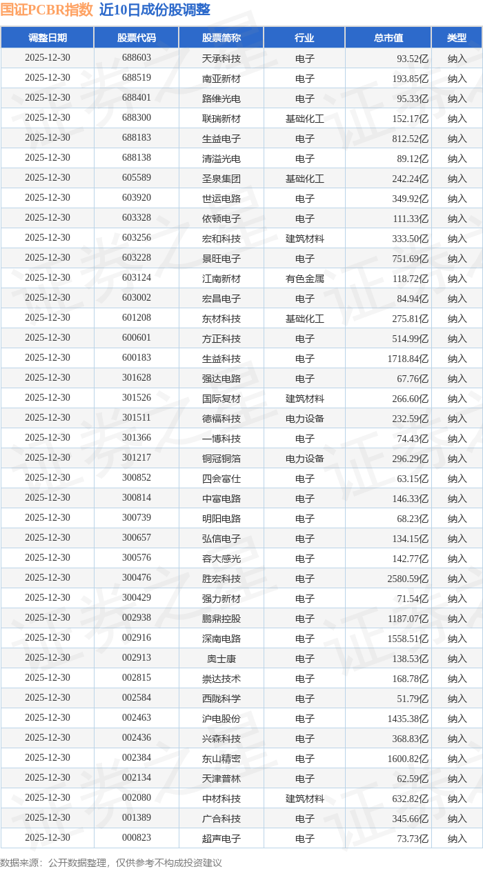 近10日内国证PCBR(98011501)指数成份股做了调整,新纳入了40只股票。