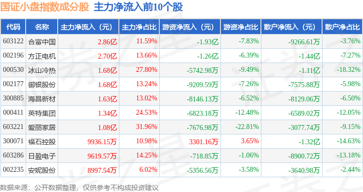 资金流向方面,国证小盘(980202)指数成份股当日主力资金净流出合计11.93亿元,游资资金净流出合计5.78亿元,散户资金净流入合计13.31亿元。成份股资金流向详情见下表: