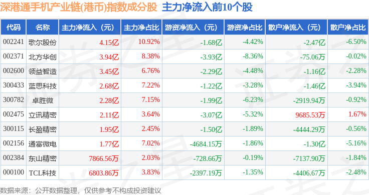 资金流向方面,深港通手机产业链(港币)(983010)指数成份股当日主力资金净流出合计4.33亿元,游资资金净流出合计11.57亿元,散户资金净流入合计15.9亿元。成份股资金流向详情见下表: