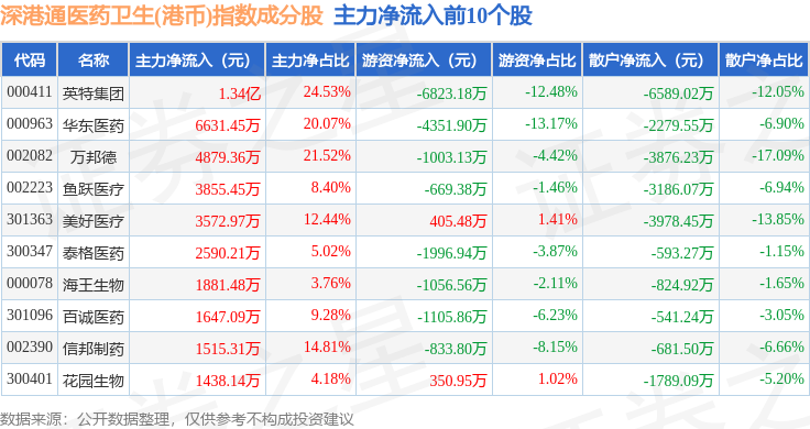 资金流向方面,深港通医药卫生(港币)(983024)指数成份股当日主力资金净流出合计15.48亿元,游资资金净流出合计2.02亿元,散户资金净流入合计17.49亿元。成份股资金流向详情见下表: