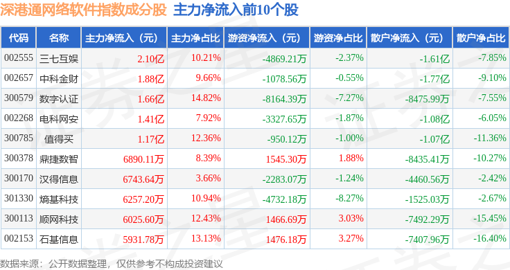 资金流向方面,深港通网络软件(983047)指数成份股当日主力资金净流出合计9.48亿元,游资资金净流入合计8698.58万元,散户资金净流入合计8.61亿元。成份股资金流向详情见下表: