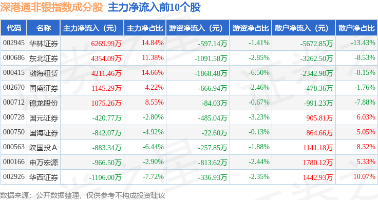 资金流向方面,深港通非银(983053)指数成份股当日主力资金净流出合计4.71亿元,游资资金净流入合计1.46亿元,散户资金净流入合计3.25亿元。成份股资金流向详情见下表: