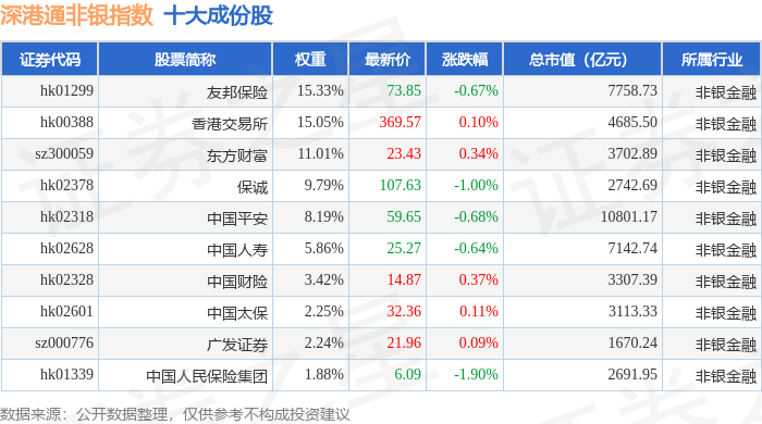 深港通非银(983053)指数十大成份股详情如下: