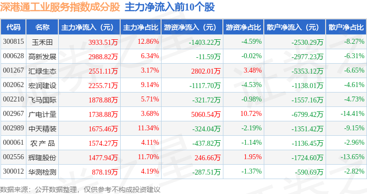 资金流向方面,深港通工业服务(983055)指数成份股当日主力资金净流出合计11.25亿元,游资资金净流入合计3.1亿元,散户资金净流入合计8.15亿元。成份股资金流向详情见下表: