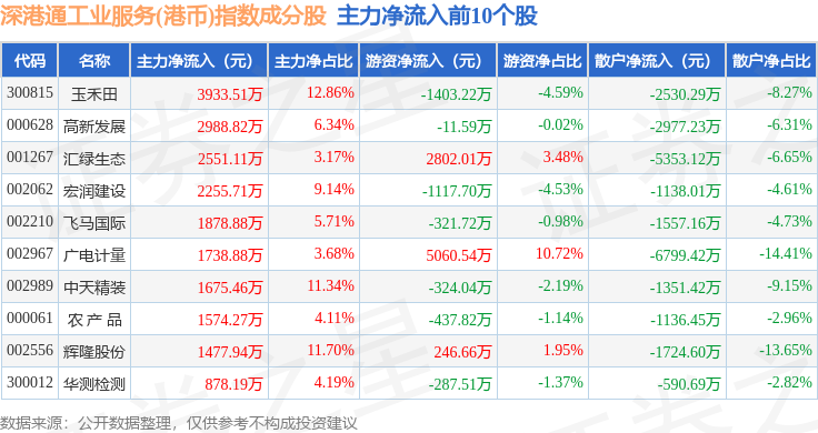 资金流向方面,深港通工业服务(港币)(983056)指数成份股当日主力资金净流出合计11.25亿元,游资资金净流入合计3.1亿元,散户资金净流入合计8.15亿元。成份股资金流向详情见下表: