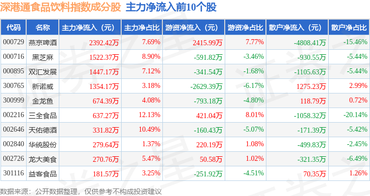 资金流向方面,深港通食品饮料(983065)指数成份股当日主力资金净流出合计6.02亿元,游资资金净流入合计2.07亿元,散户资金净流入合计3.94亿元。成份股资金流向详情见下表: