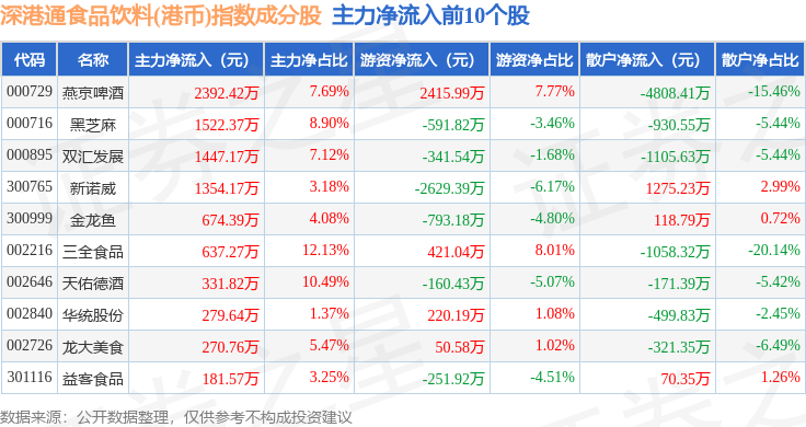 资金流向方面,深港通食品饮料(港币)(983066)指数成份股当日主力资金净流出合计6.02亿元,游资资金净流入合计2.07亿元,散户资金净流入合计3.94亿元。成份股资金流向详情见下表:
