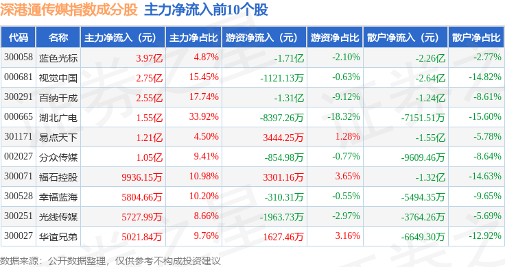 资金流向方面,深港通传媒(983075)指数成份股当日主力资金净流入合计15.62亿元,游资资金净流出合计1.74亿元,散户资金净流出合计13.88亿元。成份股资金流向详情见下表: