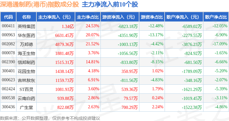 资金流向方面,深港通制药(港币)(983080)指数成份股当日主力资金净流出合计8.82亿元,游资资金净流出合计8081.01万元,散户资金净流入合计9.63亿元。成份股资金流向详情见下表: