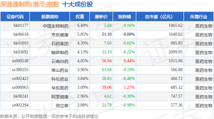 深港通制药(港币)(983080)指数十大成份股详情如下: