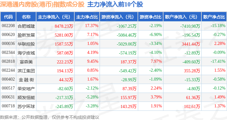 资金流向方面,深港通内房股(港币)(983084)指数成份股当日主力资金净流出合计2.23亿元,游资资金净流出合计2944.95万元,散户资金净流入合计2.52亿元。成份股资金流向详情见下表: