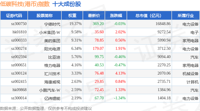 低碳科技(港币)(983161)指数十大成份股详情如下: