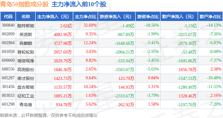 资金流向方面,青岛50(989011)指数成份股当日主力资金净流入合计39.49万元,游资资金净流出合计2954.43万元,散户资金净流入合计2914.95万元。成份股资金流向详情见下表:
