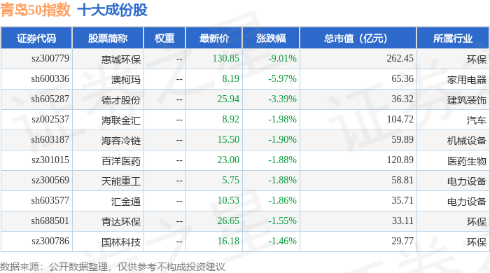 证券之星消息,12月30日,青岛50(989011)指数报收于2380.05点,涨0.08%,成交100.28亿元,换手率1.64%。当日该指数成份股中,上涨的有13家,酷特智能以20.0%的涨幅领涨,下跌的有28家,惠城环保以9.01%的跌幅领跌。