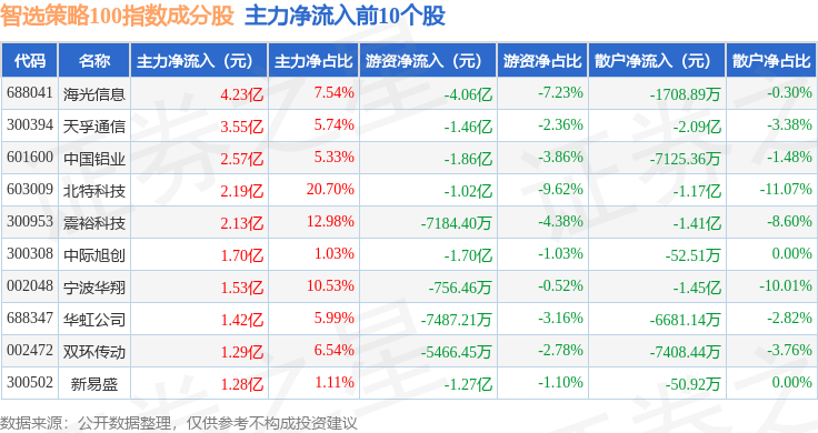 资金流向方面,智选策略100(989015)指数成份股当日主力资金净流出合计35.96亿元,游资资金净流出合计4.12亿元,散户资金净流入合计40.08亿元。成份股资金流向详情见下表: