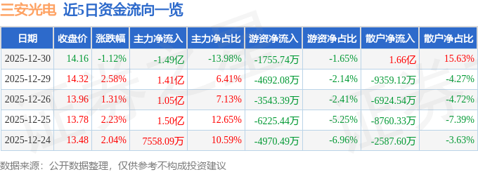 证券之星消息,截至2025年12月30日收盘,三安光电(600703)报收于14.16元,下跌1.12%,换手率1.5%,成交量74.84万手,成交额10.64亿元。