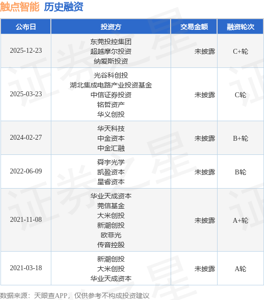 证券之星消息,根据天眼查APP于12月23日公布的信息整理,东莞触点智能装备有限公司C+轮融资,融资额未披露,参与投资的机构包括东莞投控集团,超越摩尔投资,纳爱斯投资。