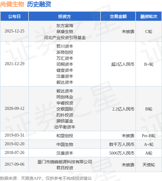证券之星消息,根据天眼查APP于12月25日公布的信息整理,杭州尚健生物技术有限公司C轮融资,融资额未披露,参与投资的机构包括东方富海,鼎康生物,河北产业投资引导基金。
