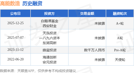 证券之星消息,根据天眼查APP于12月25日公布的信息整理,高能数造(西安)技术有限公司A+轮融资,融资额未披露,参与投资的机构包括白鹅潭基金,西安财金。