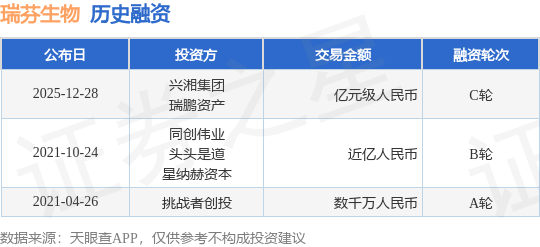 证券之星消息,根据天眼查APP于12月28日公布的信息整理,北京瑞芬生物科技股份有限公司C轮融资,融资额亿元级人民币,参与投资的机构包括兴湘集团,瑞鹏资产。