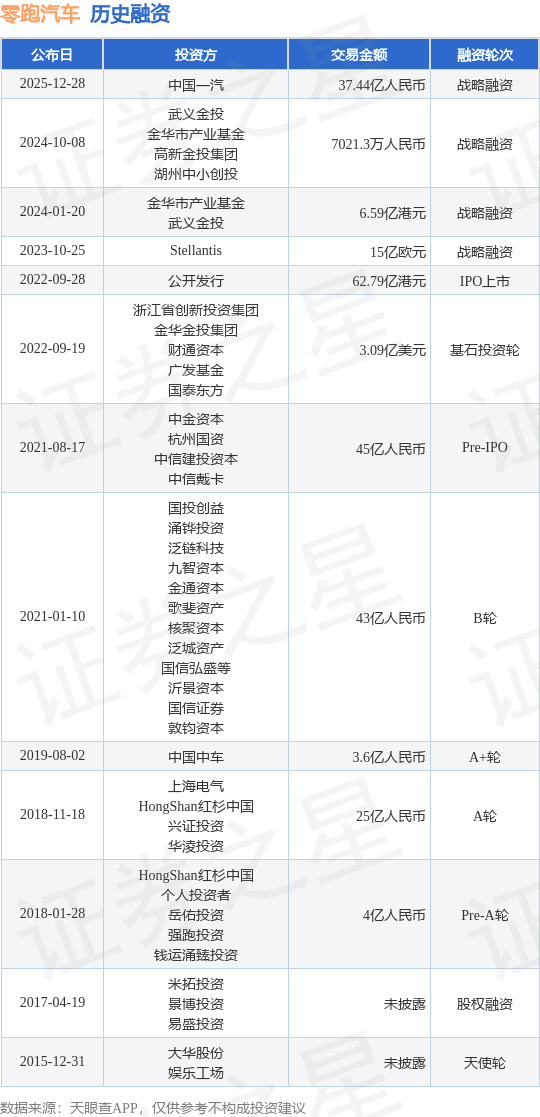 证券之星消息,根据天眼查APP于12月28日公布的信息整理,浙江零跑科技股份有限公司战略融资,融资额37.44亿人民币,参与投资的机构包括中国一汽。