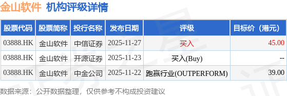 截至2025年12月30日收盘,金山软件(03888.HK)报收于28.26港元,上涨1.29%,成交量687.67万股,成交额1.94亿港元。投行对该股的评级以跑赢行业(OUTPERFORM)为主,近90天内共有1家投行给出跑赢行业(OUTPERFORM)评级,近90天的目标均价为42港元。中信证券最新一份研报给予金山软件买入评级,目标价45港元。