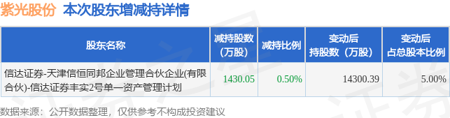 证券之星消息,12月30日紫光股份发布公告《紫光股份:关于持股5%以上股东权益变动暨触及1%整数倍的提示性公告》,其股东信达证券-天津信恒同邦企业管理合伙企业(有限合伙)-信达证券丰实2号单一资产管理计划于2025年12月11日至2025年12月30日间合计减持1430.05万股,占公司目前总股本的0.5%,变动期间该股股价下跌3.02%,截止12月30日收盘报24.73元。