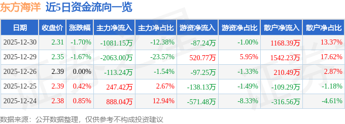 证券之星消息,截至2025年12月30日收盘,东方海洋(002086)报收于2.31元,下跌1.7%,换手率2.38%,成交量37.7万手,成交额8735.94万元。
