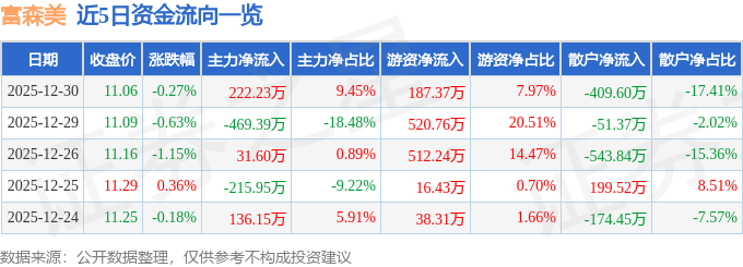 证券之星消息,截至2025年12月30日收盘,富森美(002818)报收于11.06元,下跌0.27%,换手率0.71%,成交量2.13万手,成交额2352.34万元。