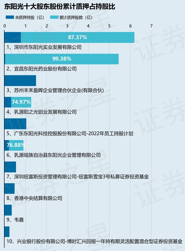 截止本公告日,股东深圳市东阳光实业发展有限公司已累计质押股份5.42亿股,占其持股总数的87.37%,股东宜昌东阳光药业股份有限公司已累计质押股份5.42亿股,占其持股总数的99.38%,股东乳源阳之光铝业发展有限公司已累计质押股份9600.0万股,占其持股总数的74.97%,股东乳源瑶族自治县东阳光企业管理有限公司已累计质押股份7000.0万股,占其持股总数的76.88%。本次质押后东阳光十大股东的累计质押股份占持股比例(占持股比例的计算以公司最新一期财务报表公布的十大股东的持股总数为基准)见下图: