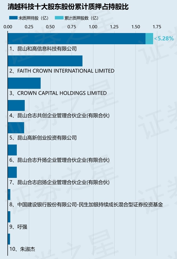 截止本公告日,股东昆山和高信息科技有限公司已累计质押股份900.0万股,占其持股总数的5.28%。本次质押后清越科技十大股东的累计质押股份占持股比例(占持股比例的计算以公司最新一期财务报表公布的十大股东的持股总数为基准)见下图: