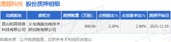 证券之星消息,清越科技(688496)12月31日公开信息显示,股东昆山和高信息科技有限公司向义乌清越光电技术研究院有限公司合计质押900.0万股,占总股本2.0%。质押详情见下表: