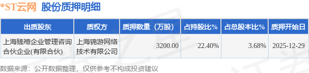证券之星消息,*ST云网(002306)12月31日公开信息显示,股东上海臻禧企业管理咨询合伙企业(有限合伙)向上海锦游网络技术有限公司合计质押3200.0万股,占总股本3.68%。质押详情见下表: