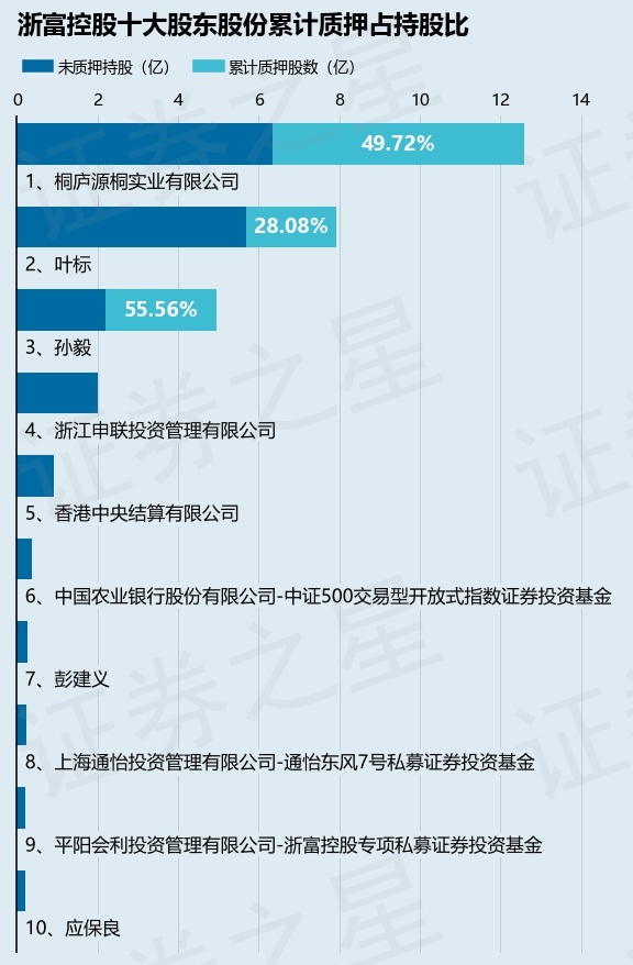 截止本公告日,股东桐庐源桐实业有限公司已累计质押股份6.27亿股,占其持股总数的49.72%,股东叶标已累计质押股份2.22亿股,占其持股总数的28.08%,股东孙毅已累计质押股份2.76亿股,占其持股总数的55.56%。本次质押后浙富控股十大股东的累计质押股份占持股比例(占持股比例的计算以公司最新一期财务报表公布的十大股东的持股总数为基准)见下图: