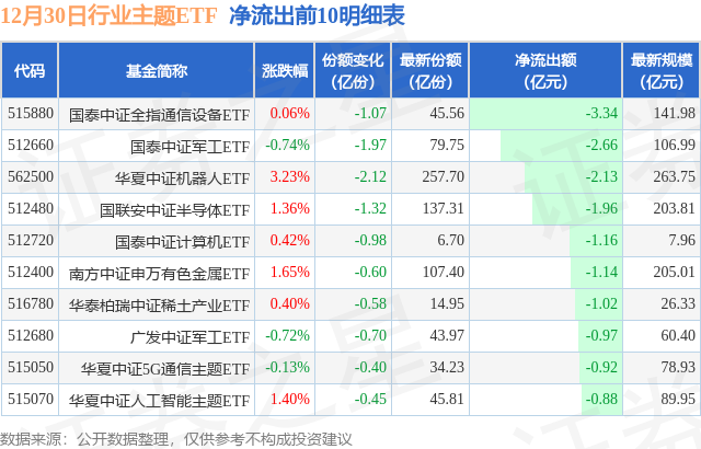 当日有128只行业主题ETF基金出现资金净流出,其中净流出排首位的是国泰中证全指通信设备ETF(515880),份额减少了1.07亿份,净流出额为3.34亿元。