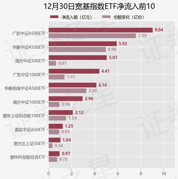 当日有39只宽基指数ETF基金出现资金净流入,其中净流入排首位的是广发中证A500ETF(563800),份额增加了7.59亿份,净流入额为9.04亿元。